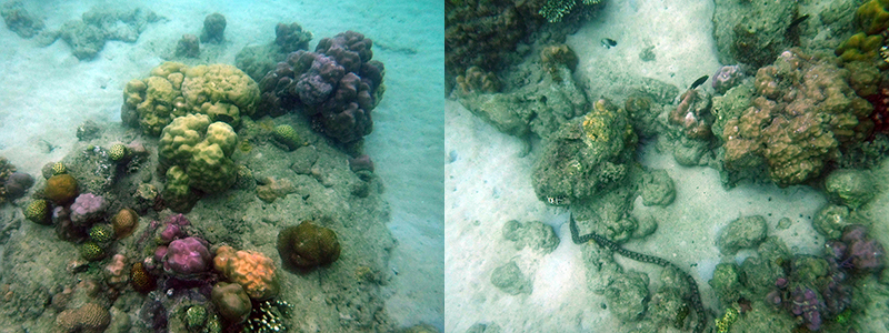 최근에 날씨가 좋지 않았음에도 불구하고, 깊은 바닥까지 속이 훤히 들여다 보이는 바다의 투명함과 그 속에서 펼쳐지는 산호와 형형색색의 물고기들을 보며 우리는 흥분하지 않을 수 없었다.