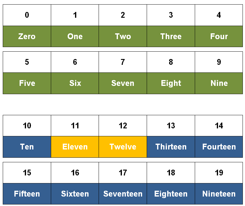 11에서 19 사이에서는 Eleven과 Twelve를 빼고는 뒤에 -teen이 붙는 구조를 가지고 있다.