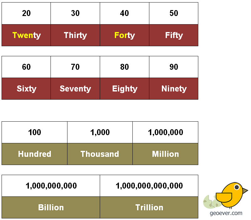 십 단위에서 20부터 90 모두 -teen 대신에 -ty가 붙는 구조인데, 철자에서 Twenty와 Forty만 11에서 19 사이의 표기와 부분적으로 다른 것을 알 수 있다.
