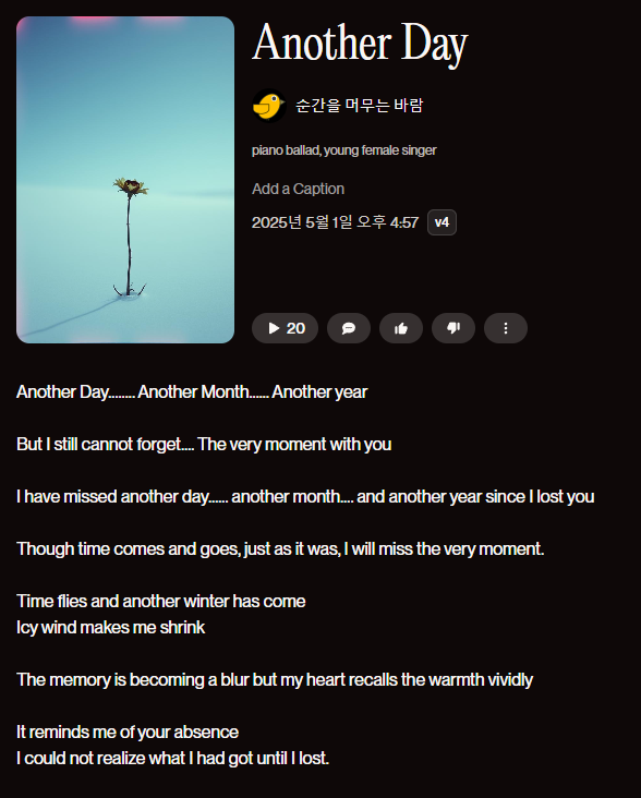 최근에 새로 즐기고 있는 취미가 생겼다. 내가 끄적인 글에 A.I.의 작곡 도움을 받아서 나만의 노래를 만드는 것이다. 우연히, Youtube를 보다가, SUNO라는 A.I.가 사람이 쓴 가사를 가지고 노래를 만들어 주는 것을 알게 되었다.그래서 호기심에 예전에 노래를 만들기는 했지만, 제대로 마무리하지 못하고 미완으로 있었던 Another Day의 가사를 붙여 봤는데... 처음 만들어진 곡이 너무 내 맘에 드는 거다.아니, 이런 신세계가 있다니.... 그래서, 바로 유료 결재를 하고는 Another Day로 만들어진 곡에 대한 권리를 확보했다. 그러고 나서, 이번에는 예전에 한글로 끄적였던 것들을 붙여 봤는데... 괜찮다. https://youtube.com/shorts/GlPgtnu6dKg?si=Z..
